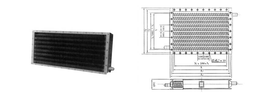 散熱器的翅片管均用中21×21nm尤縫鋼管繞制—1215×、0.5mm皺折鋼帶而成,呈螺旋狀,其中片距:有5mm—大“D”,6mm—中“Z”,8mm-小“X”,三種共有三十八種規格。