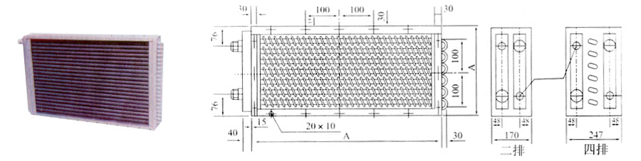 GL II型為鋼制雙回路(二排)或多回路(四排)的空氣熱交換揣。翅片管用φ18×2mm無(wú)縫鋼管繞制上10×0.3mm鋼帶而成,呈螺絲旋狀,可有各種表面管數,管長(cháng)排數組成多種規格,進(jìn)出水管位于同一側,工質(zhì)熱源為蒸汽或高溫水,冷源為低溫水或鹽水,可用作空氣加熱器或空氣冷卻器,是一種經(jīng)濟耐用通用散熱器。